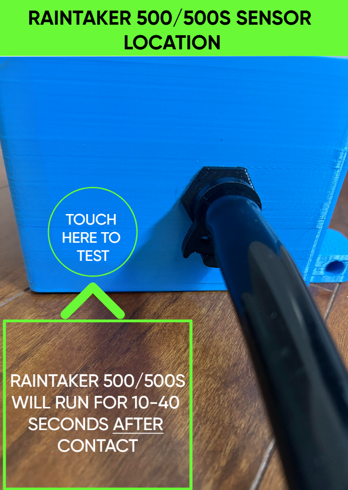 After charging, please use the test feature as shown in the picture below to ensure Raintaker is operating correctly. You can also press on the area shown to pulse any remaining water out of your bilge, depending on placement.